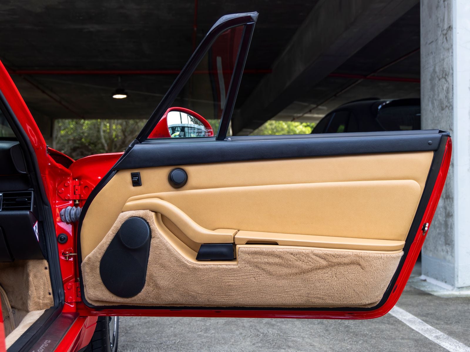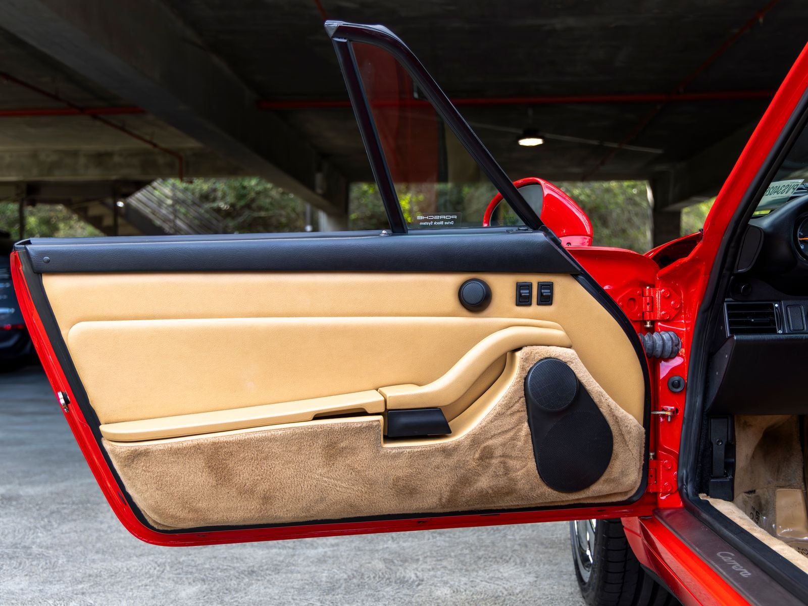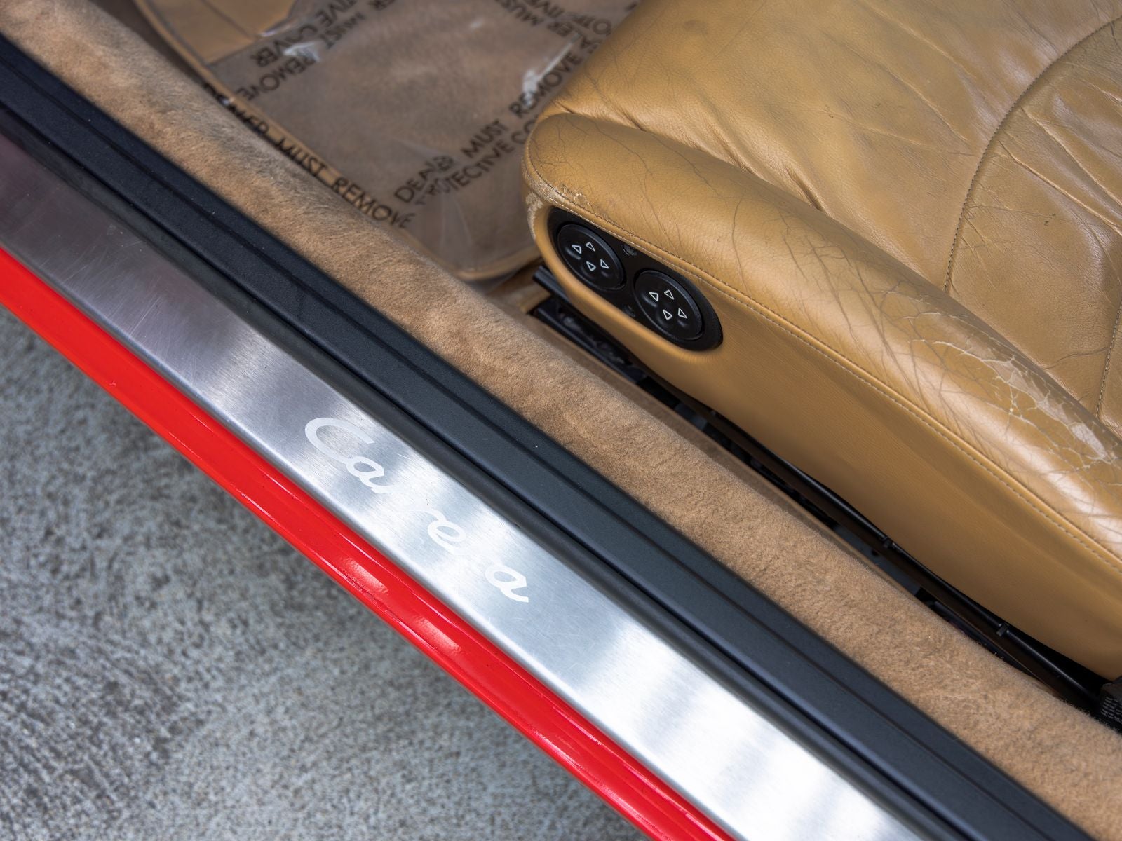 The exterior stands out in Guards Red, a signature Porsche color that highlights the unmistakable lines of the 911. It rides on Technology hollow-spoke wheels, complemented by silver wheel caps with the colored Porsche crest, maintaining an elegant yet sporty appearance. Stainless steel door entry guards with model logo add a subtle touch of exclusivity.
