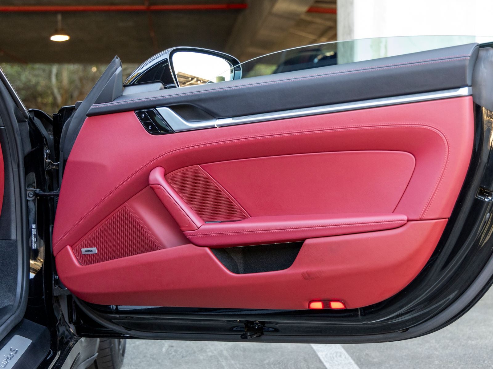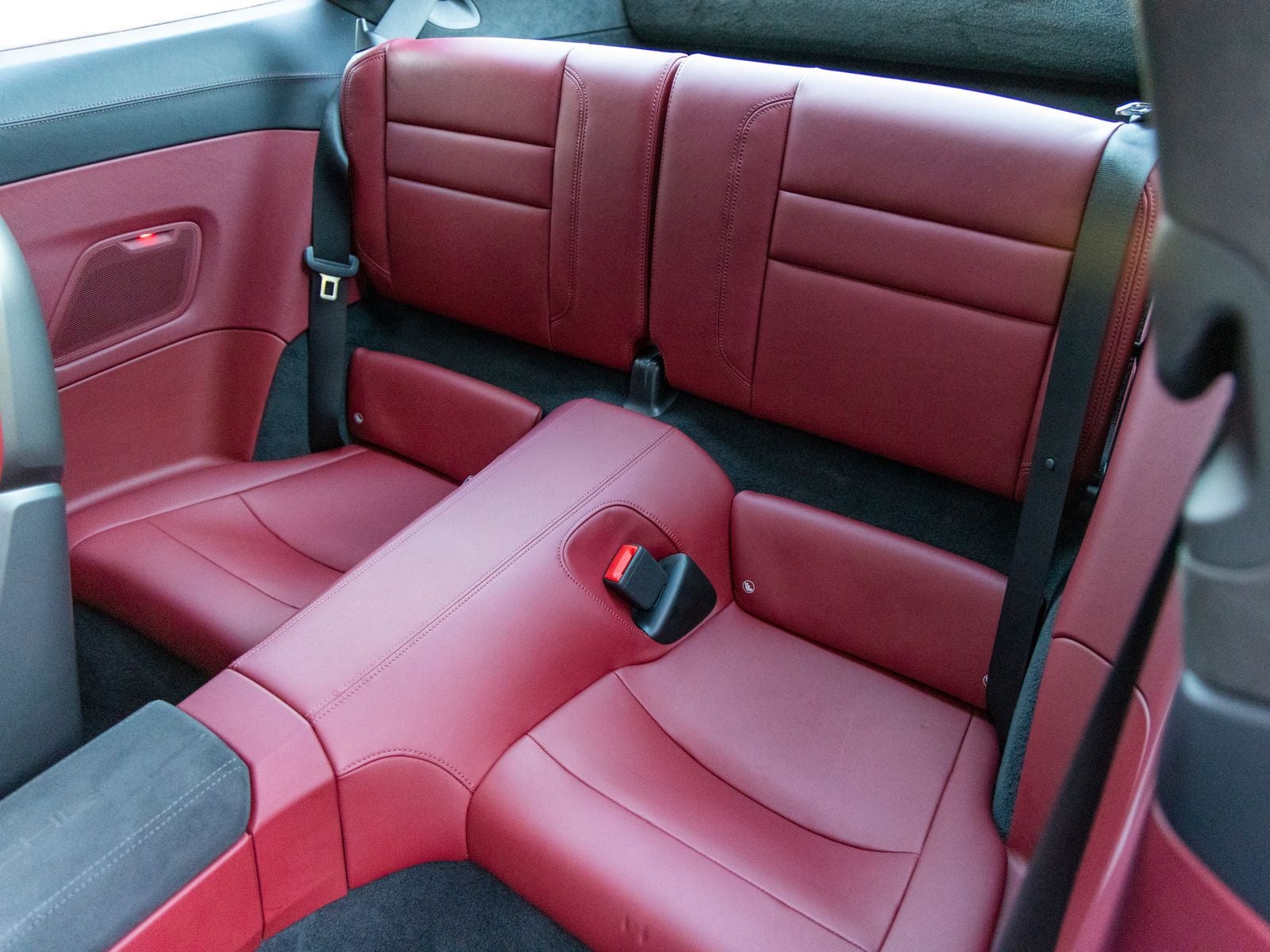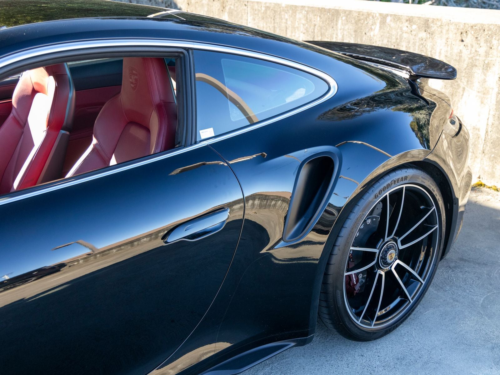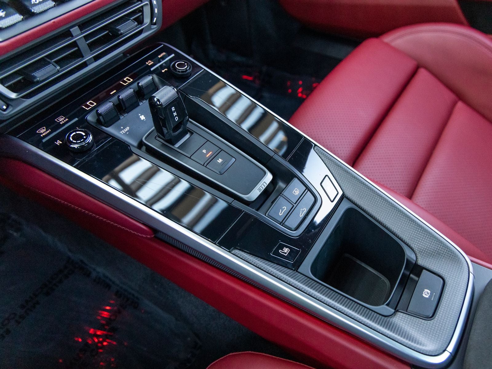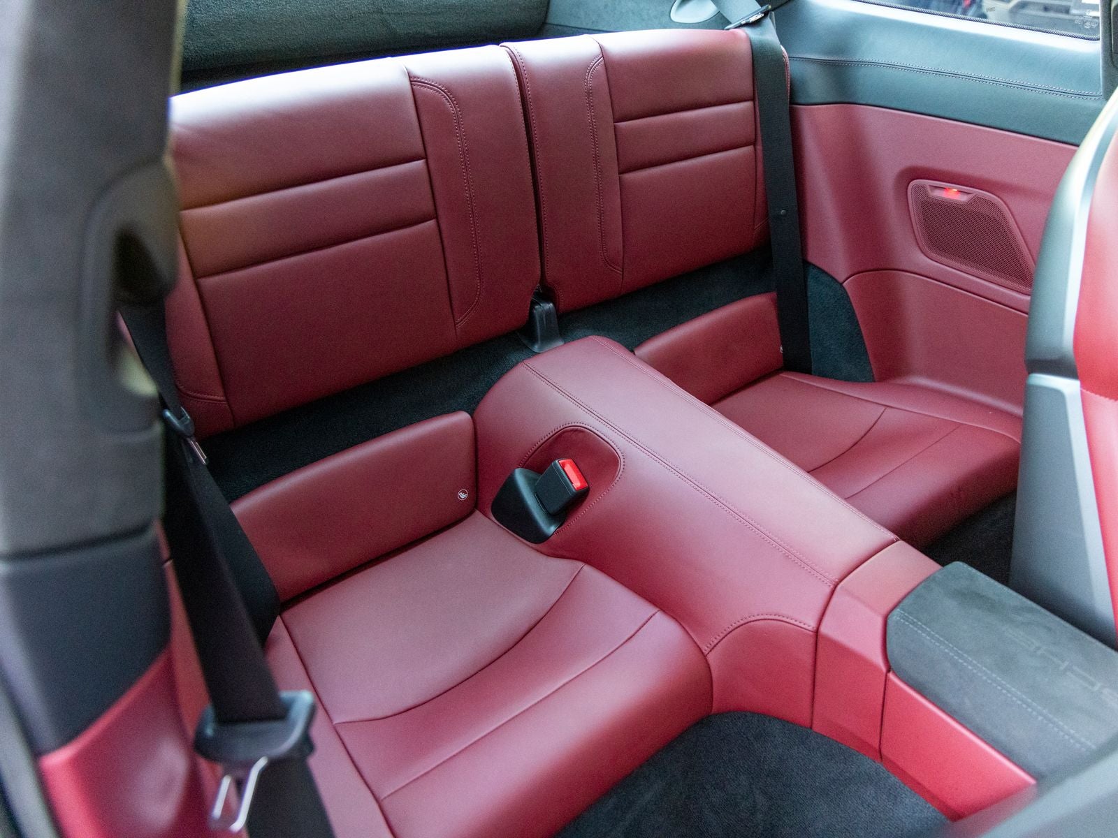 Inside, the cabin reflects a balance of sport and luxury. The Black and Bordeaux Red leather interior is paired with a central tachometer in Guards Red, reinforcing the driver-focused layout. Porsche crests on the headrests add a signature touch, while the deletion of quilting creates a cleaner, more performance-oriented aesthetic. Race-Tex accents on the steering wheel and center console lid, featuring a PORSCHE logo, further emphasize the cars sporting intent.