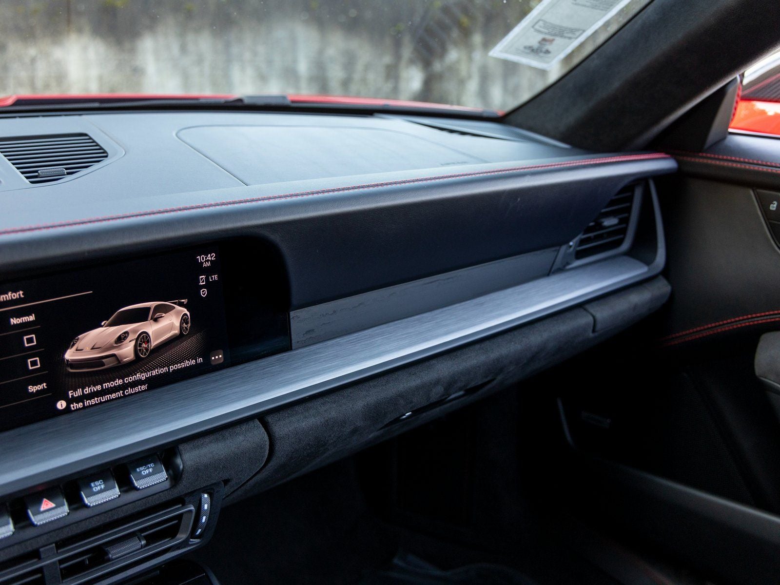 Performance enhancements include Porsche Ceramic Composite Brakes (PCCB) with high gloss black calipers, a front axle lift system, the Chrono Package with preparation for lap trigger, and Sport Chrono stopwatch dial in white paired with a central white tachometer, delivering unparalleled driver engagement. The car rides on wheels painted in satin black with outer lips in Guards Red, with an extended range fuel tank for added practicality.