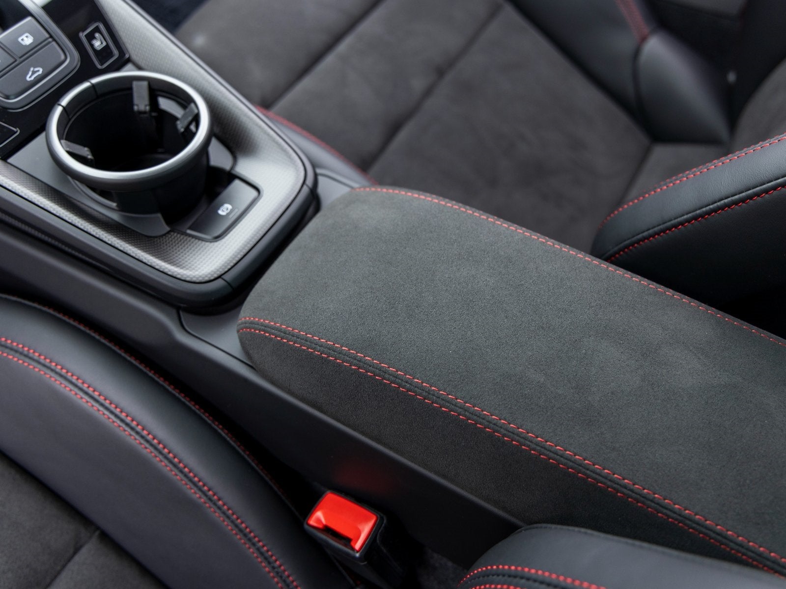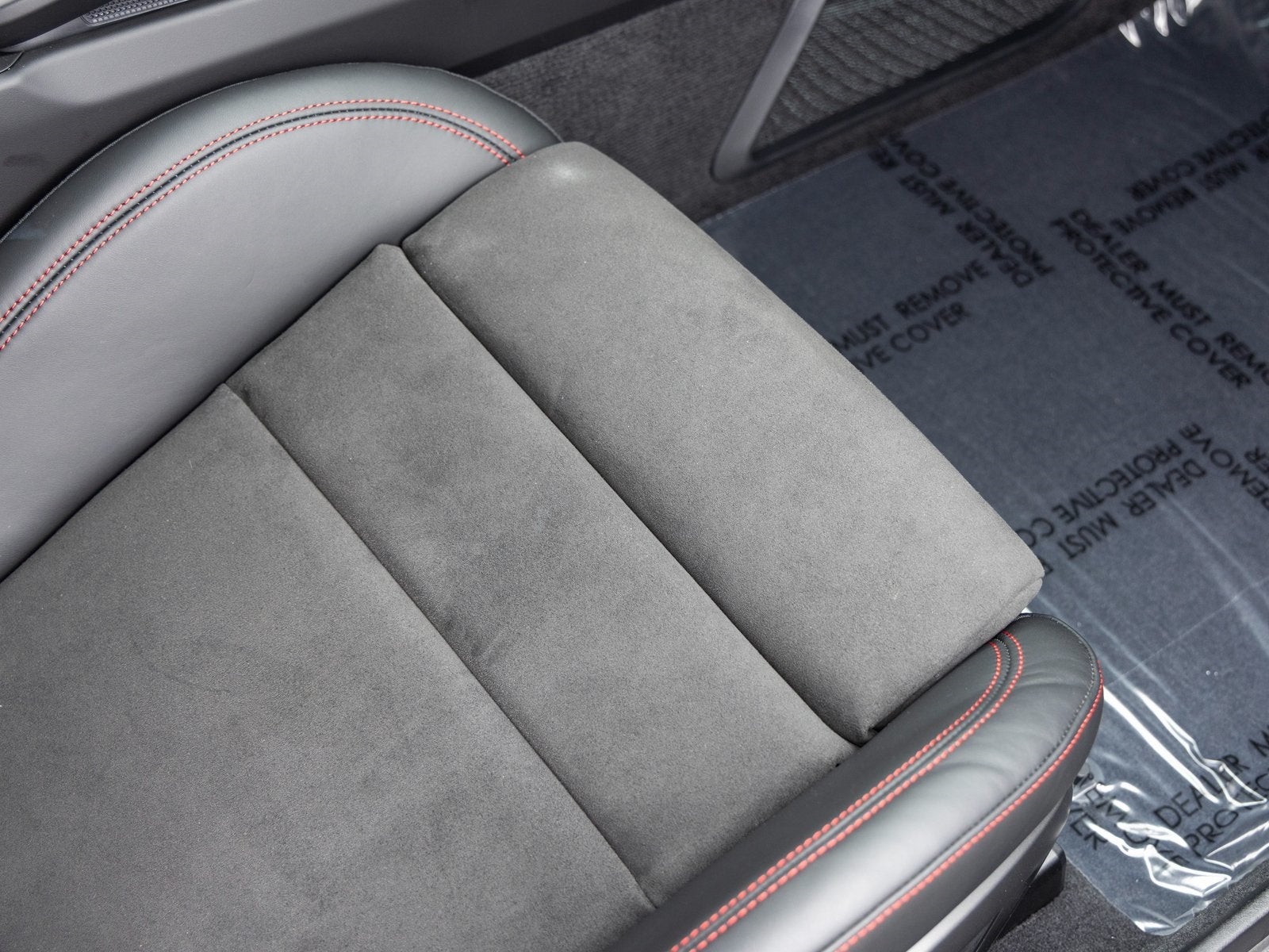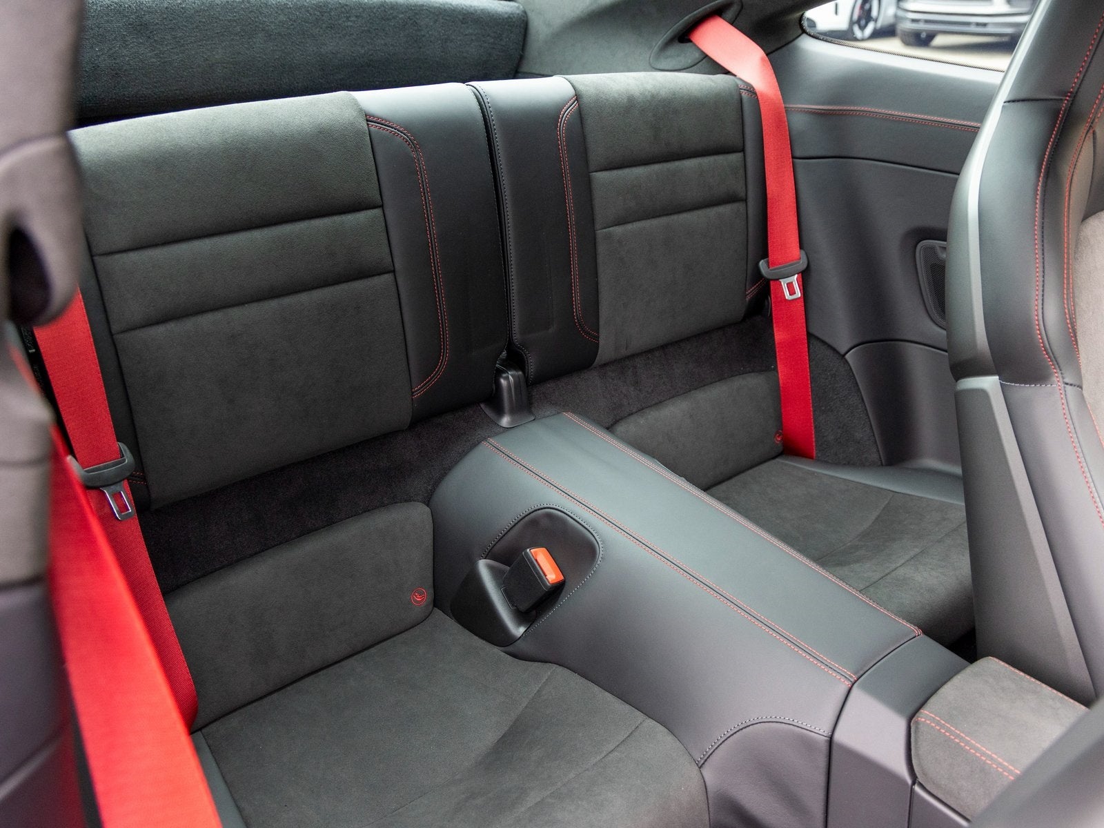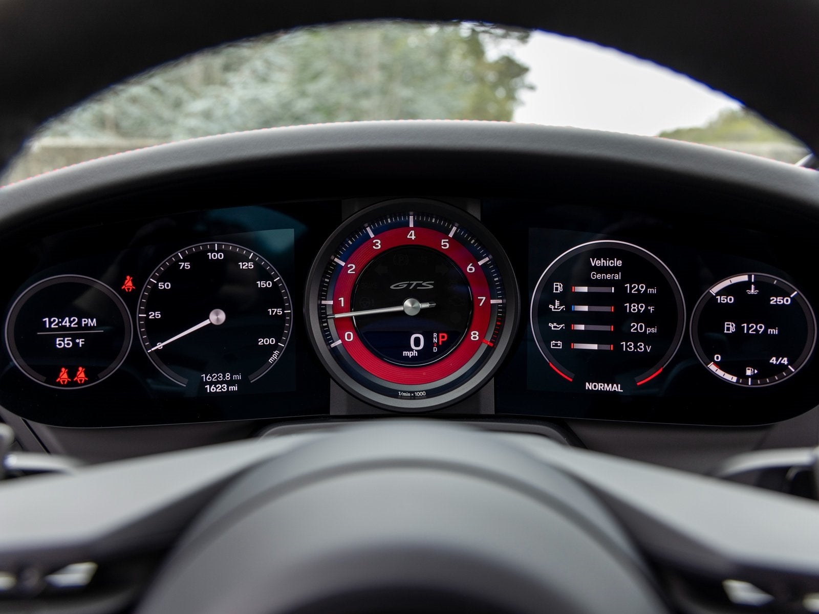 The driver-focused cabin emphasizes the GTS models sporty character, highlighted by the Carmine Red interior package, Adaptive Sport Seats Plus (18-way) with memory, a central tachometer in Carmine Red, and extensive Race-Tex elements including the roof lining, sun visors, and seat belt outlet trims. Matte carbon fiber interior inlays and vehicle keys painted in Carmine Red with a Race-Tex key pouch add distinctive finishing touches.