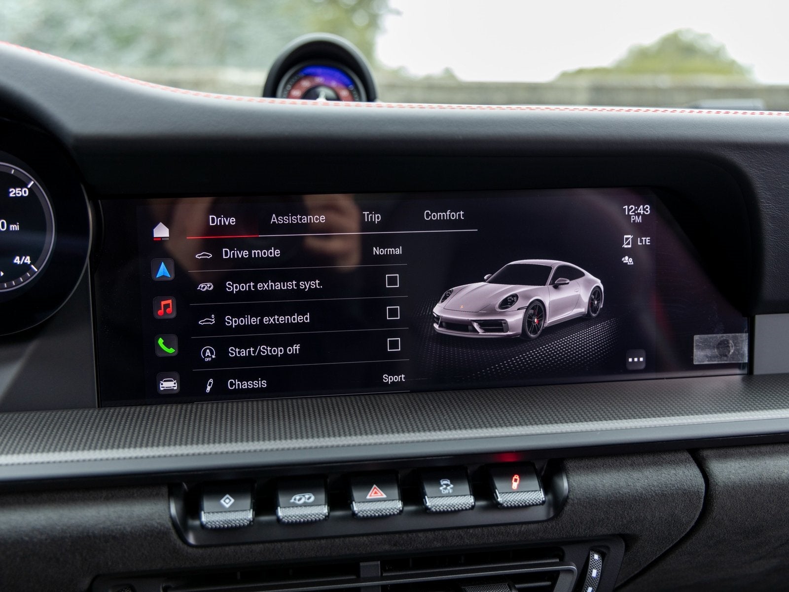 - Radio: Porsche Communication Management (PCM) -inc: online navigation module, Connect Plus (wireless Apple CarPlay and wireless Android Auto, LTE communication module, wireless internet access and numerous Porsche Connect Services), SiriusXM w/3-month Platinum Plan trial subscription, integration of Apple Music, Apple Podcasts and Spotify, voice pilot w/natural language understanding and activation via Hey Porsche, navigation plus w/real time traffic information and online map update and sound package plus (analog sound system, 8 loudspeakers, 150-watt total output w/integral amplifier and digital signal processing)