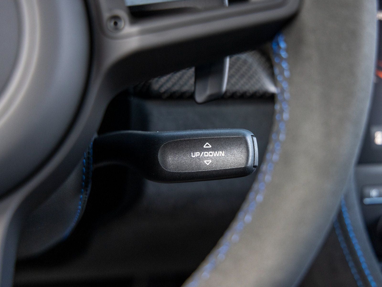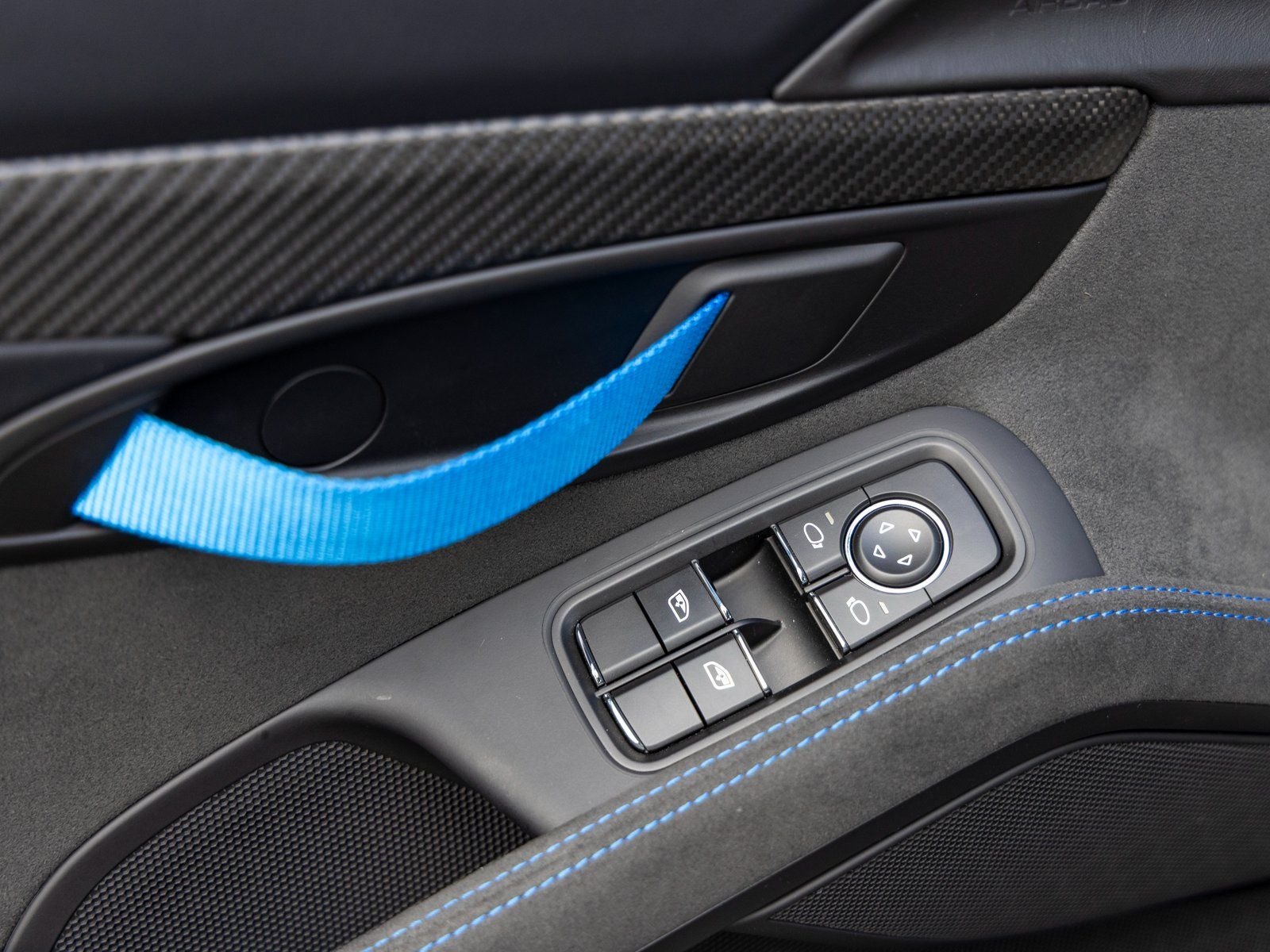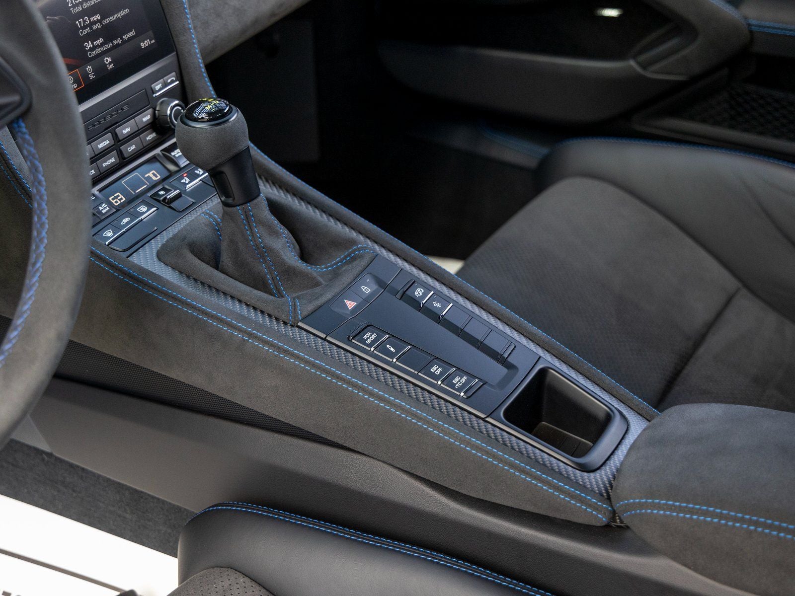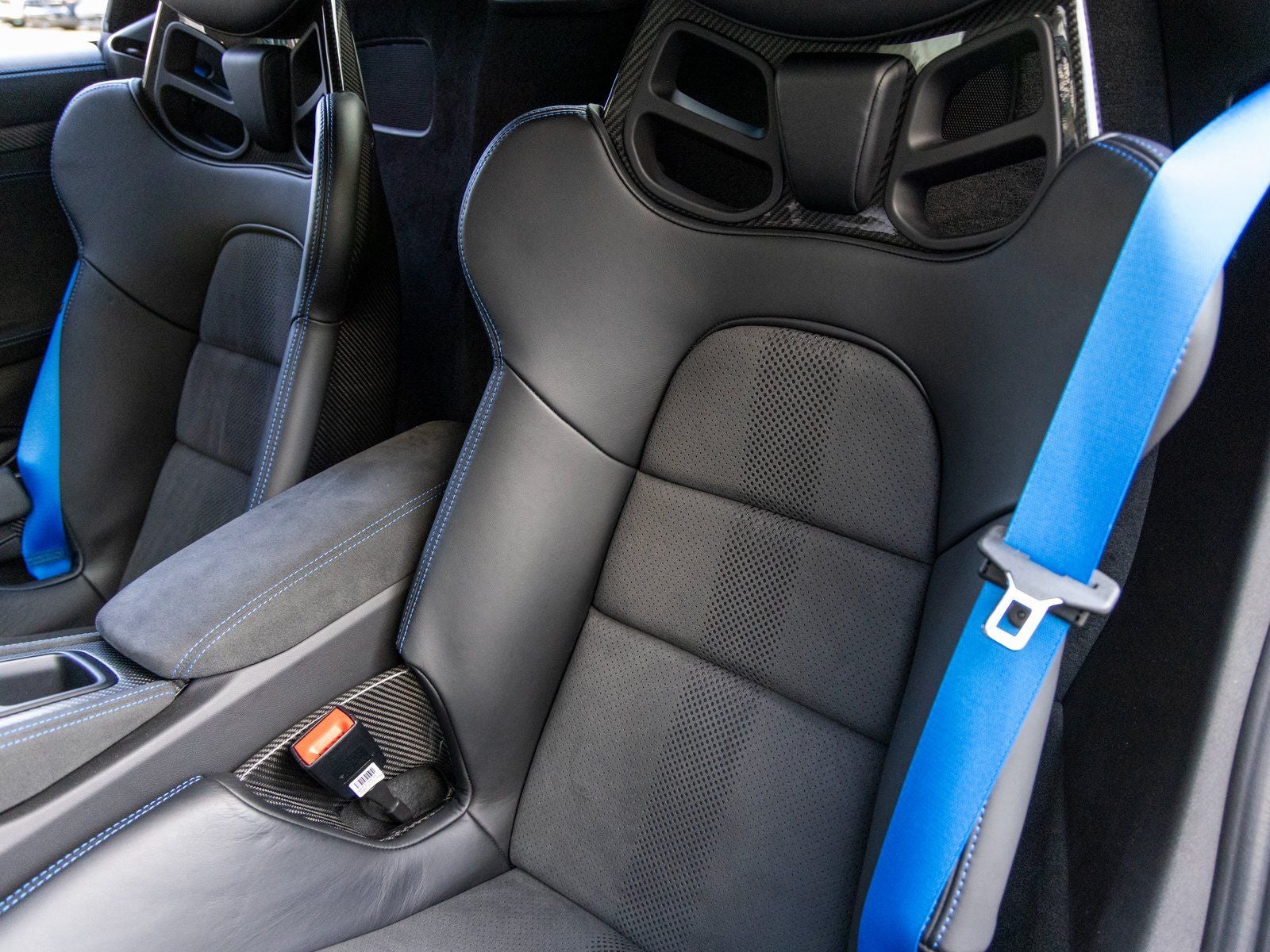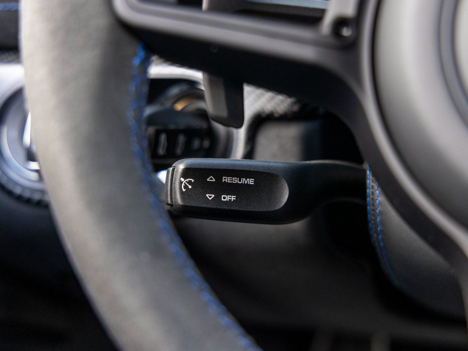 Inside, the cabin reflects meticulous attention to detail. The Leather and Race-Tex interior features Arctic Grey stitching in conjunction with the Weissach Package, complemented by an extended deviated stitching program in Speed Blue throughout the dashboard, center console, seats, steering wheel rim, door panels, and additional interior surfaces. Shark Blue seat belts and door pull loops add a bold motorsport accent, while instrument dials and the Chrono stopwatch dial in White create a striking focal point for the driver. Carbon fiber illuminated door-sill guards, a leather-wrapped steering column casing with deviated stitching, and the Door Trim Package in Leather/Race-Tex further underscore the bespoke craftsmanship.