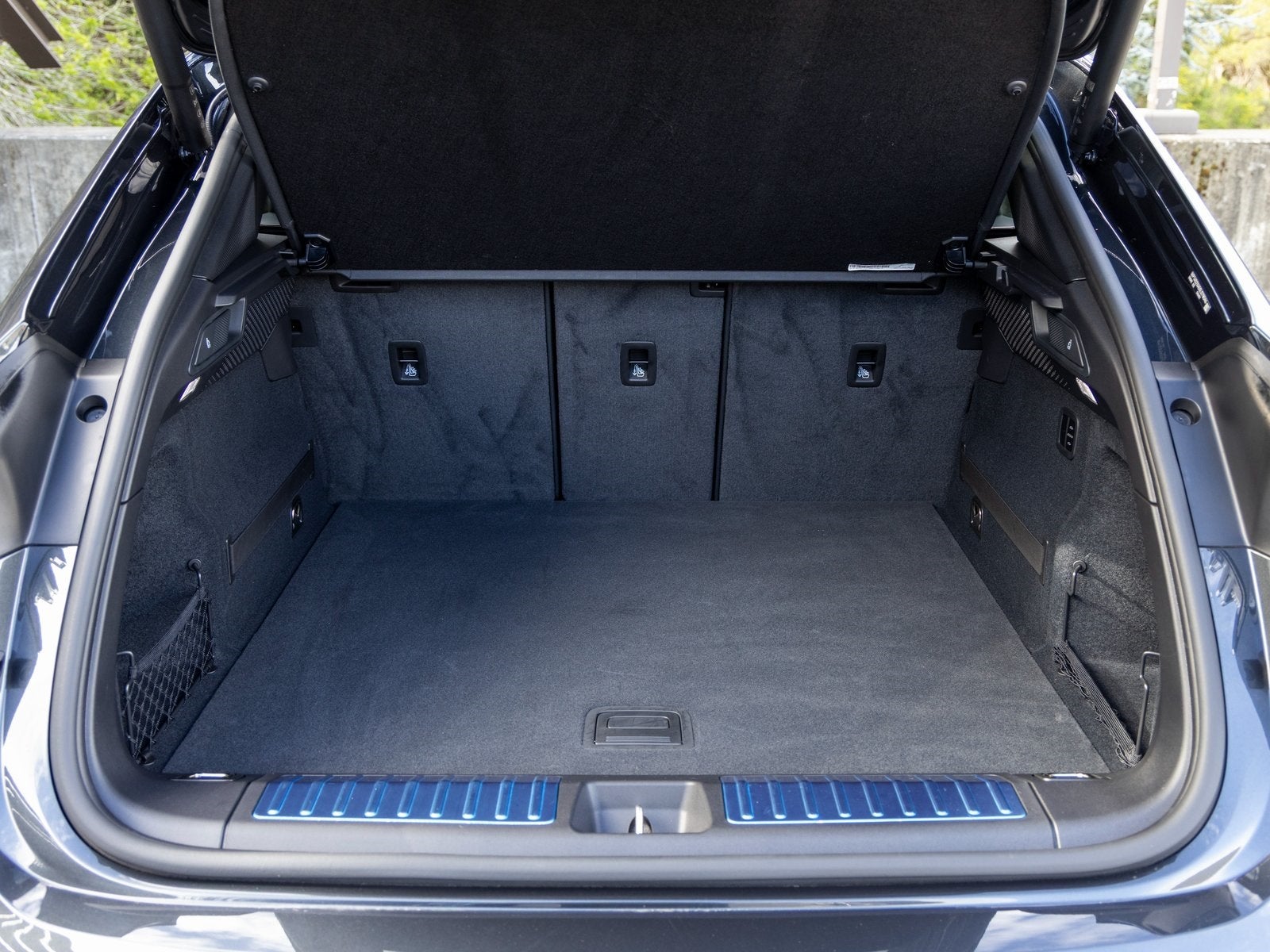 The exterior is enhanced with side blades painted in exterior color, black aluminum roof rails, a power charge port cover, colored Porsche crest wheel center caps, under door puddle light projectors, and a rear wiper for added functionality and style.