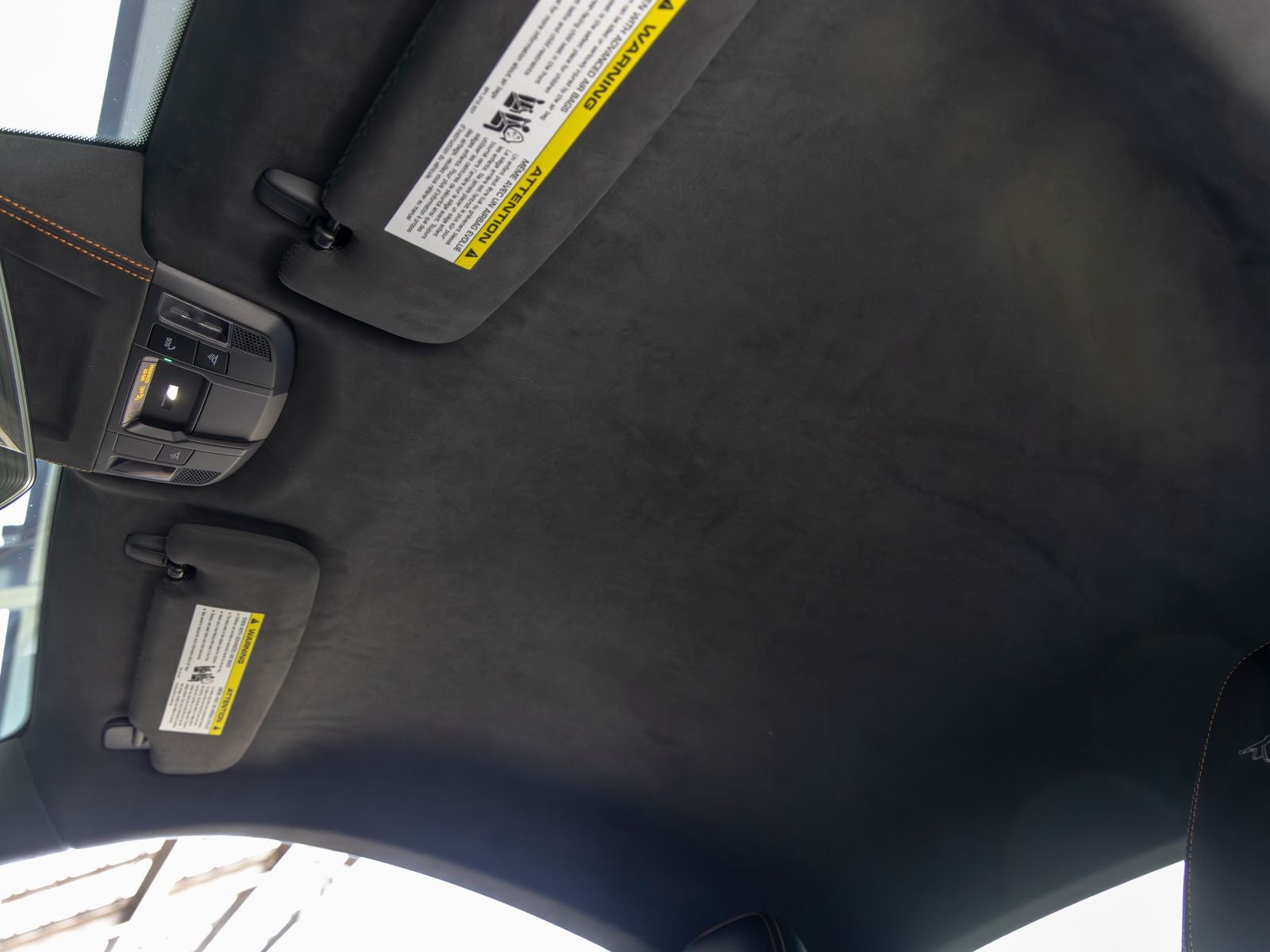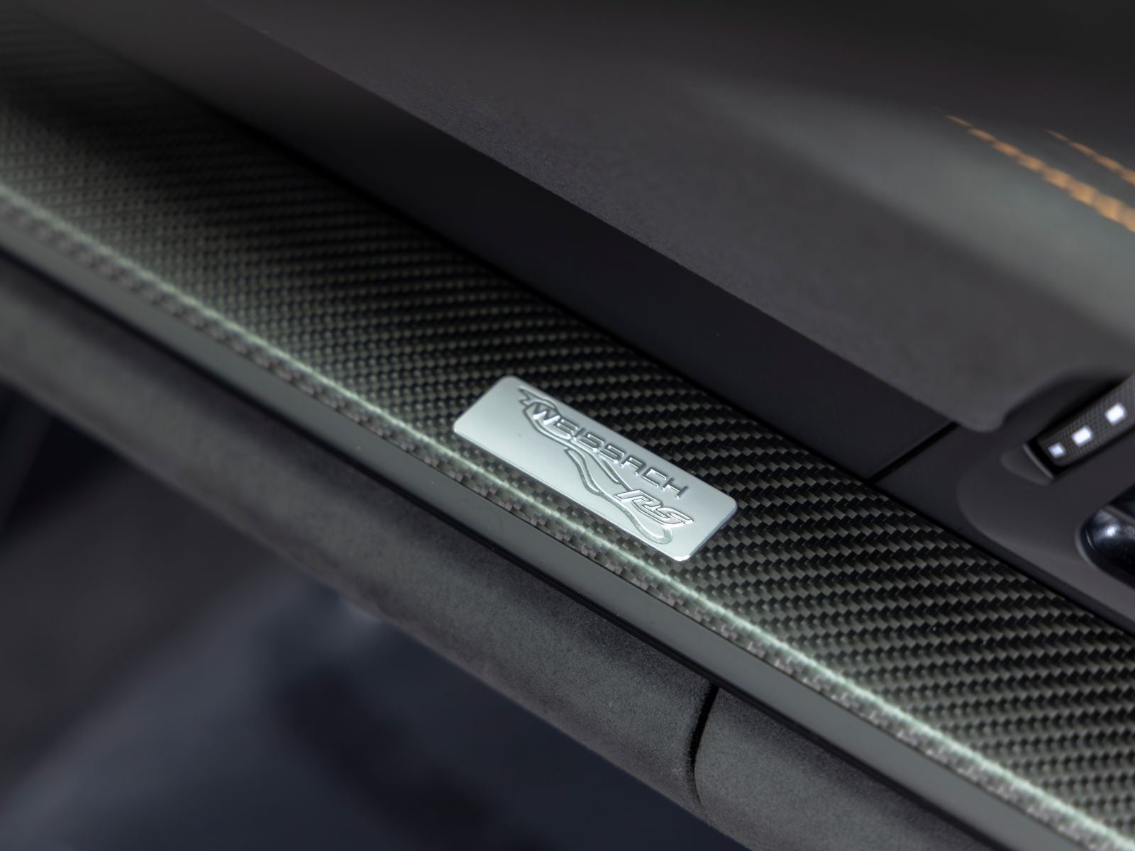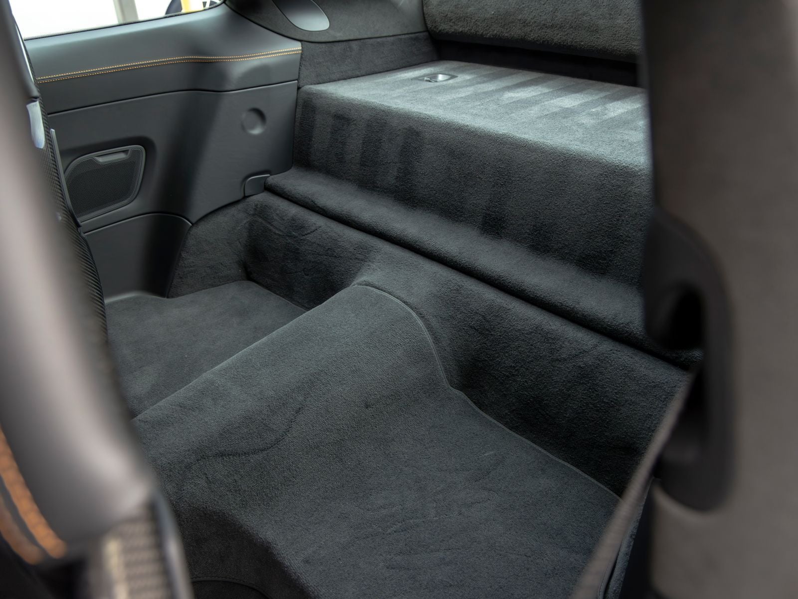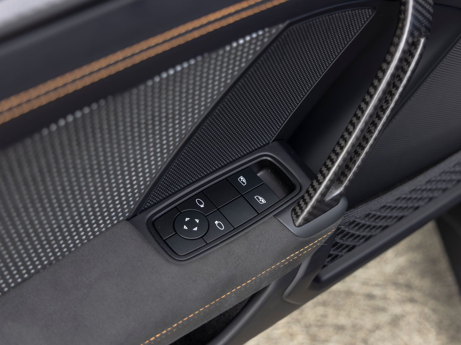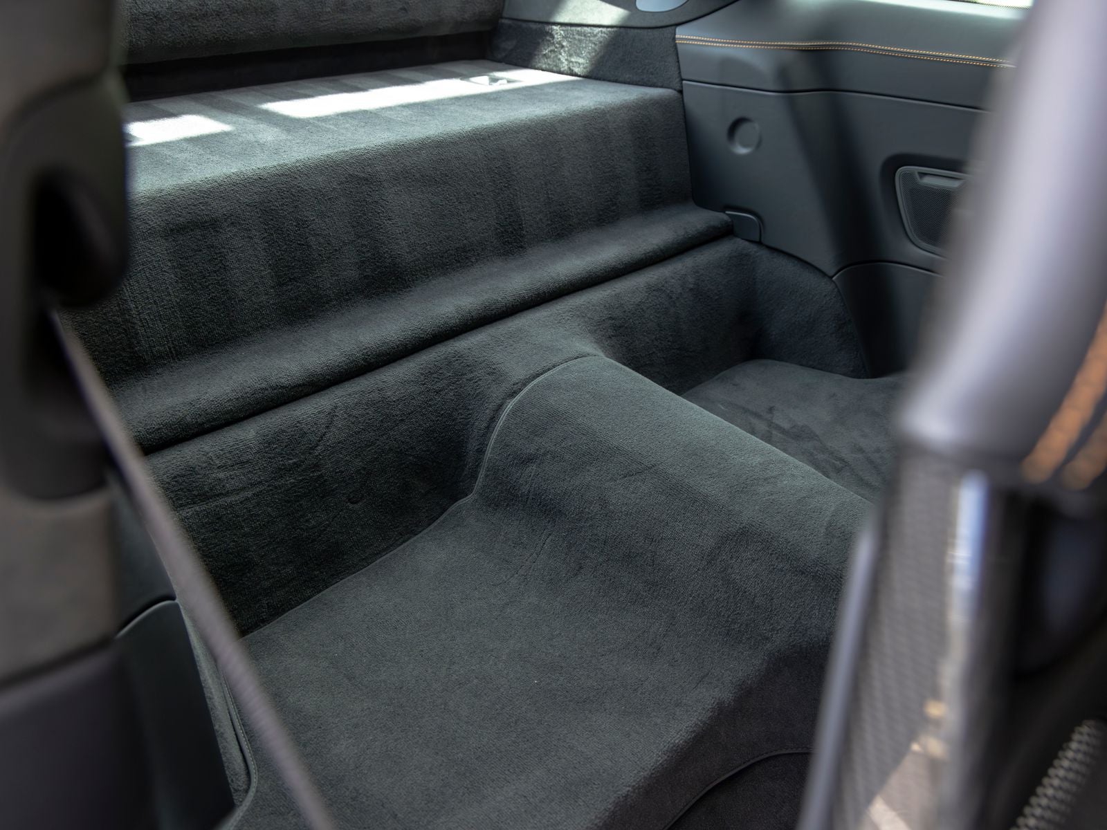 Inside, the cabin showcases a meticulous balance of lightweight materials and bespoke craftsmanship. The Leather and Race-Tex interior is elevated by a full deviated stitching package in Orange, extending across the dashboard, door panels, center console lid, knee pads, and rear side panels. An extended Race-Tex package with matching accents further enhances the cohesive design, while the steering wheel and gear lever are trimmed in Black leather for a focused, tactile driving experience. Additional details such as a leather steering column casing, illuminated matte carbon fiber door-sill guards, Race-Tex sun visors, and black door pull loops underscore the cars motorsport-inspired character.