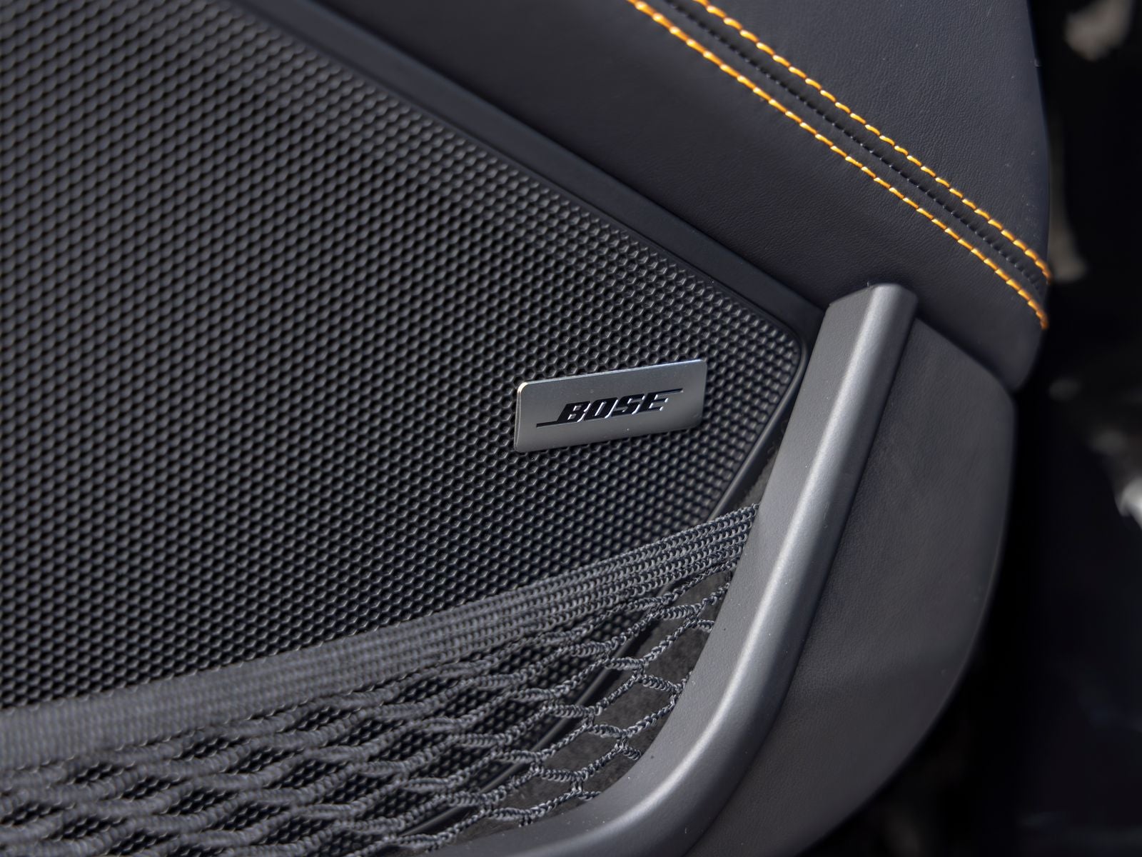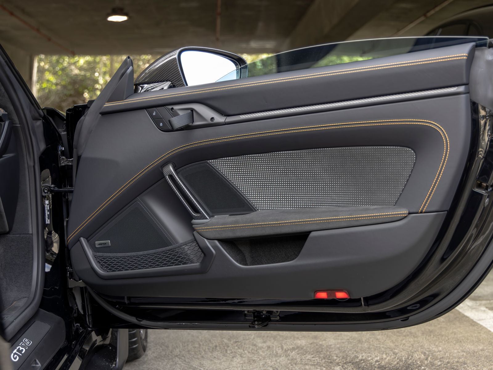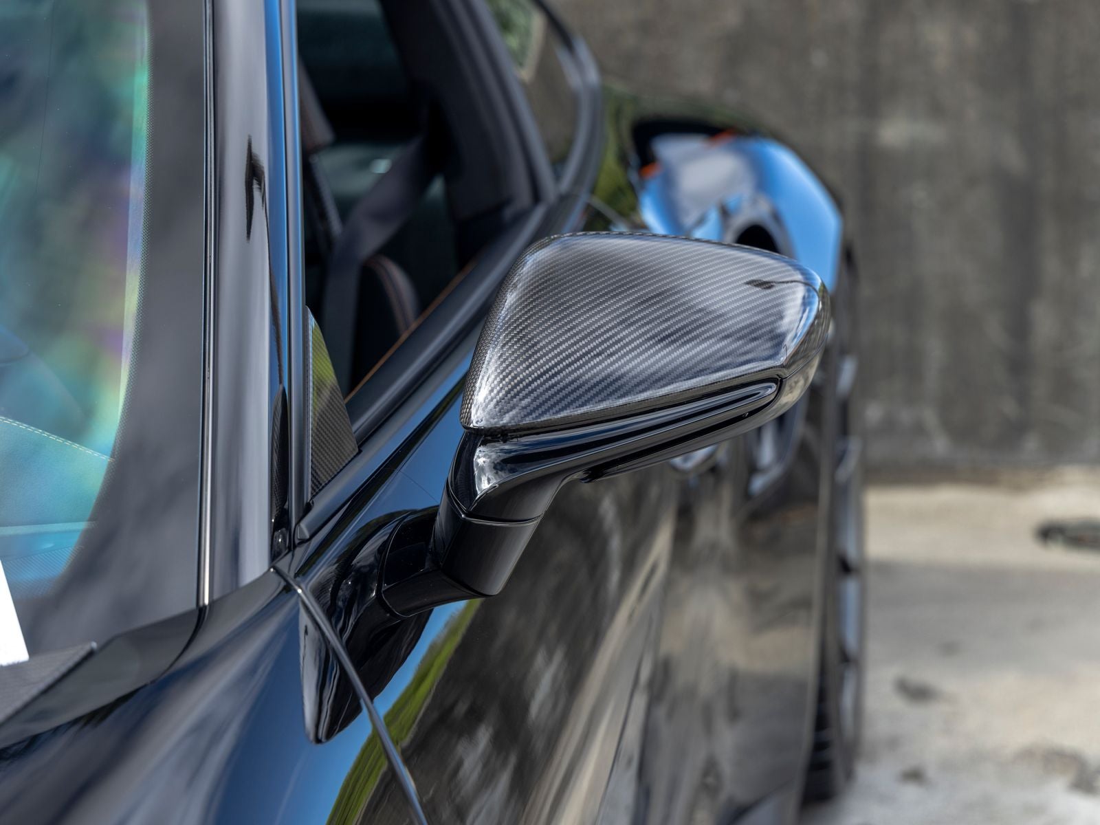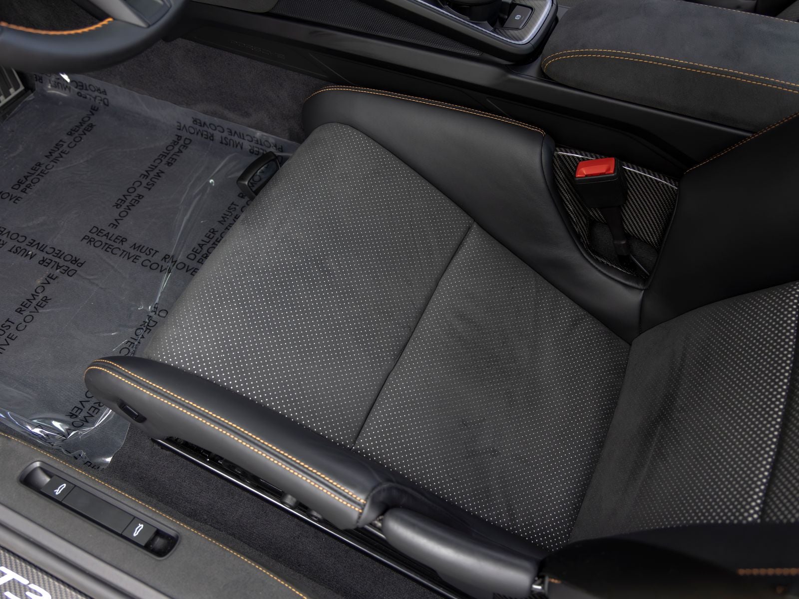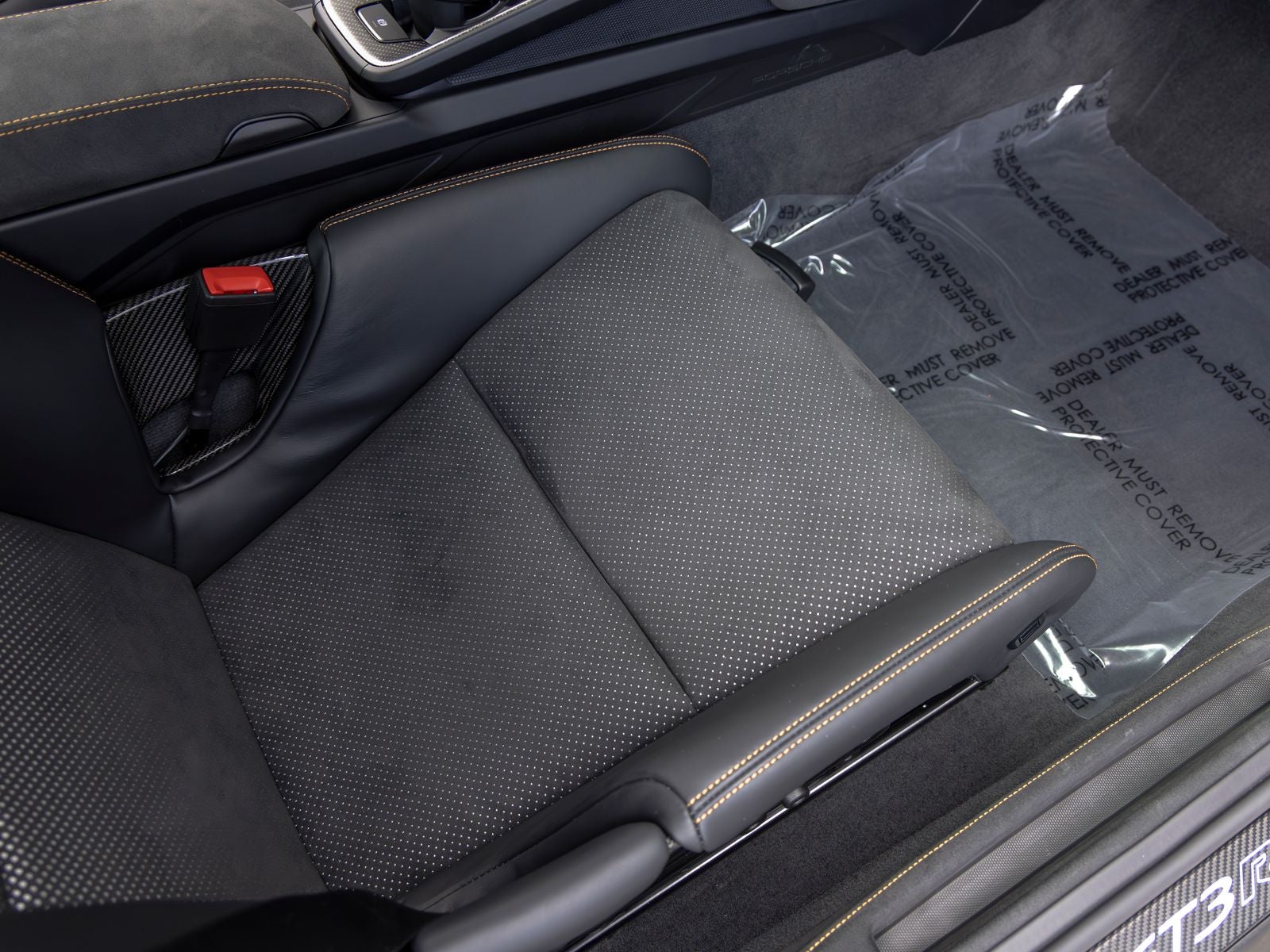 Inside, the cabin showcases a meticulous balance of lightweight materials and bespoke craftsmanship. The Leather and Race-Tex interior is elevated by a full deviated stitching package in Orange, extending across the dashboard, door panels, center console lid, knee pads, and rear side panels. An extended Race-Tex package with matching accents further enhances the cohesive design, while the steering wheel and gear lever are trimmed in Black leather for a focused, tactile driving experience. Additional details such as a leather steering column casing, illuminated matte carbon fiber door-sill guards, Race-Tex sun visors, and black door pull loops underscore the cars motorsport-inspired character.