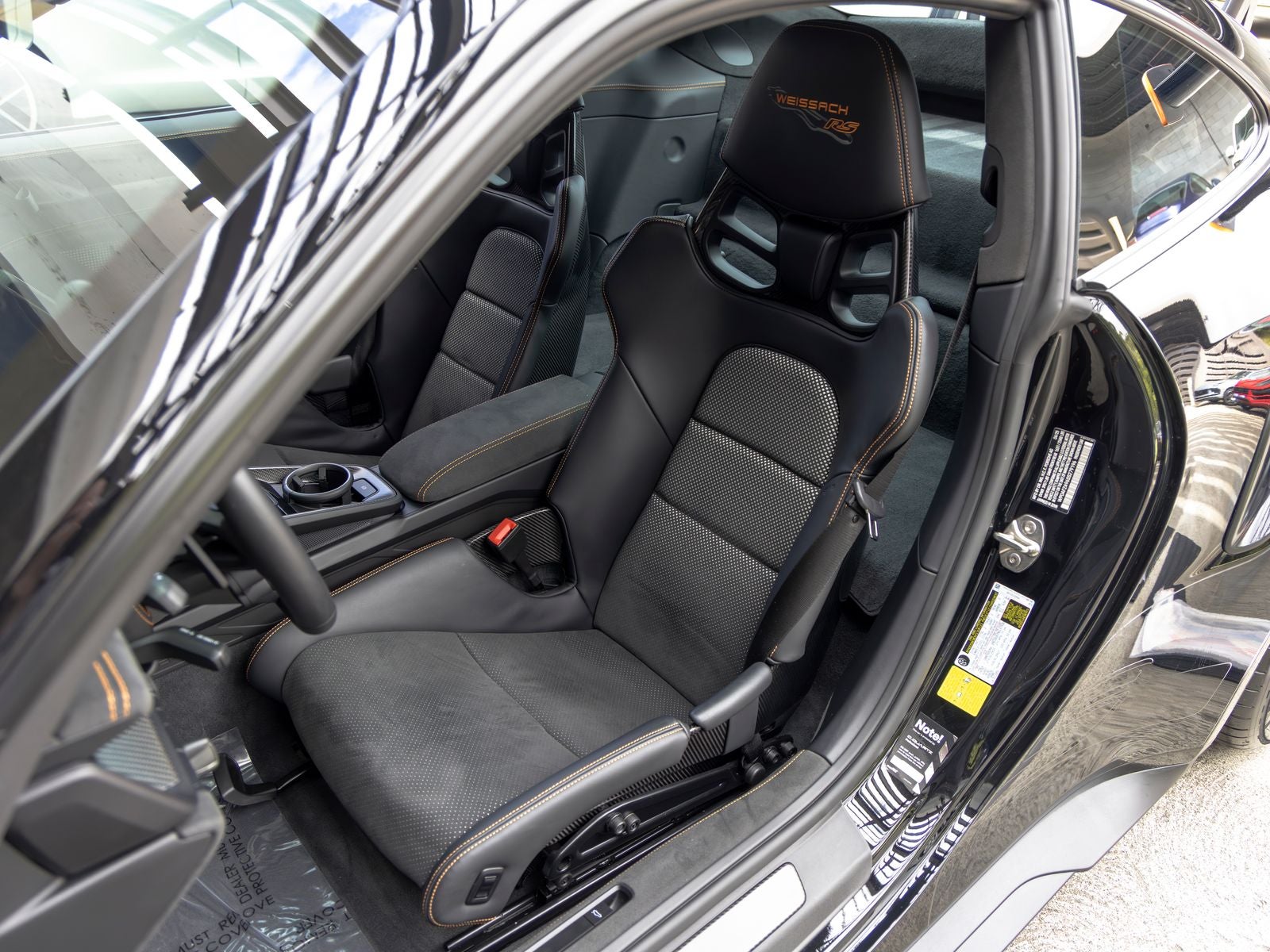 The exterior is purposefully specified with 20/21 GT3 RS forged lightweight magnesium wheels, finished in Satin Dark Silver, reinforcing both performance and visual presence. LED headlights in black with Porsche Dynamic Light System (PDLS) complement the aggressive front fascia, while Exclusive Design taillights add a modern and distinctive rear signature. BORN IN FLACHT under-door puddle light projectors provide a subtle nod to the models motorsport origins.